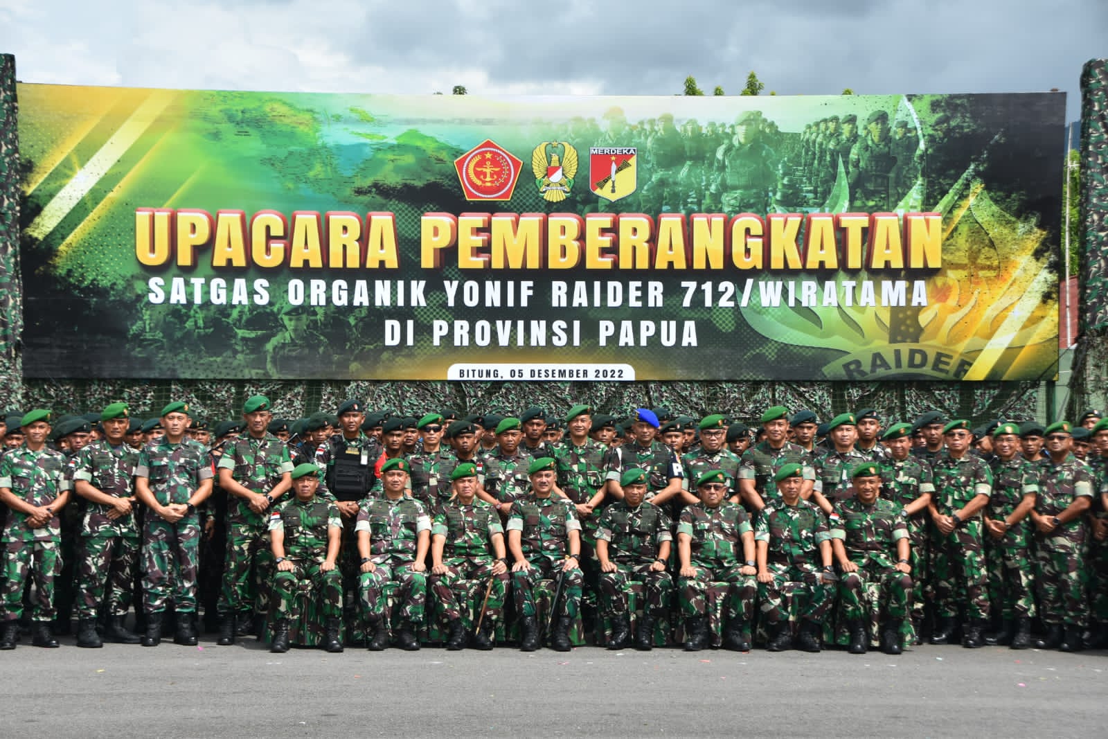 Upacara Pemberangkatan Satgas Satuan Organik Papua Yonif Raider 712/Wt, ke wilayah Provinsi Papua tersebut, dipimpin langsung oleh Pangdam XIII/Mdk, Mayjen TNI Mayjen TNI Alfret Denny D.Tuejeh,