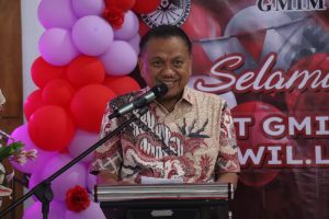Gubernur Olly menyampaikan rasa syukur atas tuntunan penyertaan Tuhan sehingga bisa beribadah dalam memperingati HUT ke-155 Jemaat GMIM Karmel Paslaten.