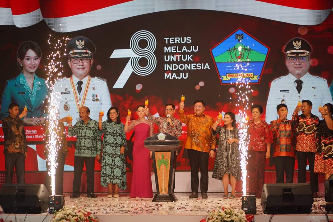 Kabar-online, Minahasa Utara– Menutup rangkaian kegiatan perayaan HUT Kemerdekaan Republik Indonesia yang ke-78 di Kabupaten Minahasa Utara, Bupati Joune Ganda, S.E. M.A.P. M.M. M.Si., didampingi Ketua TP-PKK Minut, ibu Rizya Ganda Davega, bersama Wakil Bupati Minut, Kevin W. Lotulung, S.H. M.H., didampingi Ketua 1 TP-PKK Minut, Kristi Lotulung Arina, S.E. M.M., mengikuti agenda Resepsi dan Toast Kenegaraan Kabupaten Minahasa Utara, Kamis, (17/8/2023).