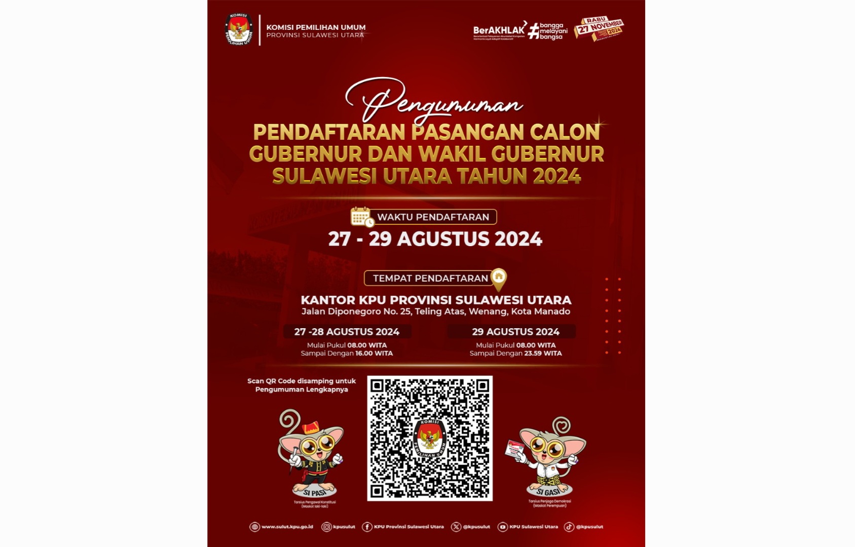 Pengumuman Pendaftaran Pasangan Calon Gubernur dan Wakil Gubernur Provinsi Sulawesi Utara Tahun 2024 Agustus 26, 2024 Redaksi Kabar-online Sulut Post Views: 378
